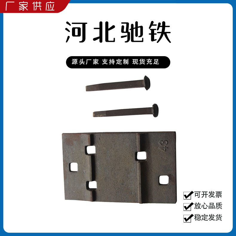 魚尾板(軌道接頭夾板)俗稱道夾板,在軌道接頭處起連接作用。分為輕軌、重軌和起重軌。魚尾板是一種用于軌道與軌道之間連接使用的連接緊固件。輕軌有8KG.9KG.12KG.15KG.18KG.22KG.24KG.30KG.輕軌魚尾板又名道夾板,重軌38KG.43KG.50KG.60KG,起重軌QU70.QU80.QU100.QU120又名起重軌斜接頭夾板。具體又有四孔和六孔兩種。按材質(zhì)區(qū)分有:球墨鑄鐵、Q235軋制、鍛造。